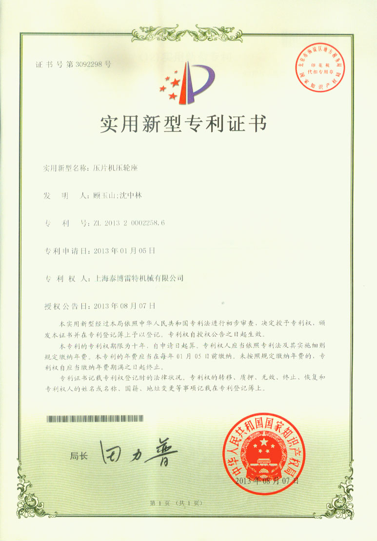 本实用新型涉及一种压片机,具体的说一种压片机压轮座,包括压轮座主体,其特征在于:压轮座主体包括底座,以及设置在底座上的左挡板,还包括设置在底座上的右挡板,压轮座主体的底座、左挡板及右挡板为一体成型呈U形结构,还包括设置在压轮座主体U形开口内的压轮,还包括一根压轮轴,压轮轴依次贯穿左挡板、压轮及右挡板,压轮轴的一端部分外露于左挡板并通过压轮轴调节装置进行固定连接,还包括一根偏心轴,偏心轴经压轮轴调节装置插入于压轮轴内。本实用新型同现有技术相比,压轮可以独立加工,同过压轮座确保压轮加工时的同心度与平行度、且安装方便稳定。压轮座采用U形一体结构且强度更可靠,并同时保障了加工精度。