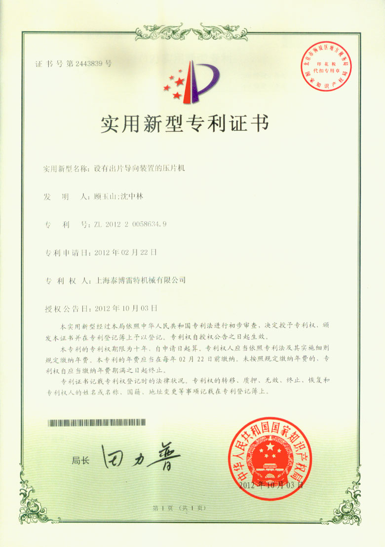 上海泰博雷特一种设有出片导向装置的压片机专利