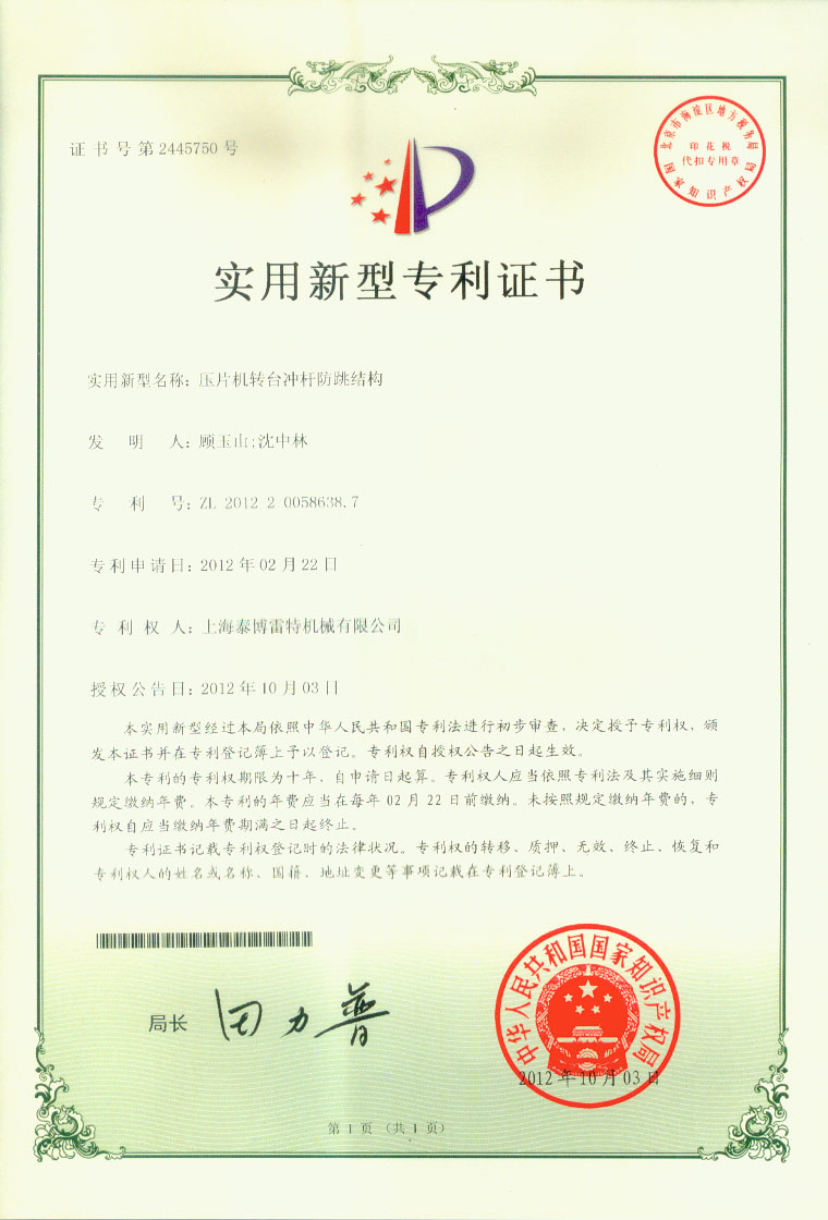 上海泰博雷特压片机转台冲杆防跳结构专利